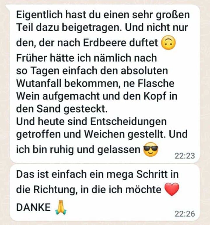 Ich arbeite mit unterschiedlichen Methoden und nachhaltiger Wirkung, die meine Kunden dabei unterstützen, ihr volles Potenzial auszuschöpfen!