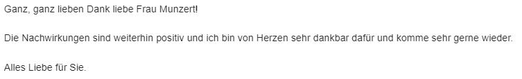 „Liebe Steffi, ich bin Dir total dankbar. Meine Schmerzen im Fuß sind nahezu weg und das nach nur einer Behandlung. Es war sehr erlösend, das dahinterliegende, seelische Thema wahrzunehmen. Das war sehr hilfreich für mich.“