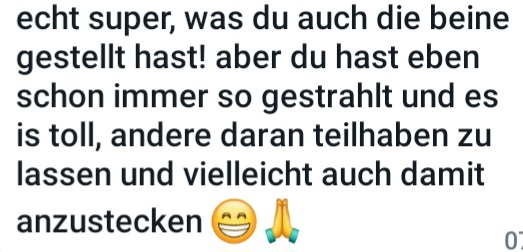 „Früher hätte ich nach solchen Tagen einfach den absoluten Wutanfall bekommen, ne Flasche Wein aufgemacht und den Kopf in den Sand gesteckt. Und heute sind Entscheidungen getroffen und Weichen gestellt. UND, ich bin ruhig und gelassen! Das ist einfach ein mega Schritt in die Richtung, in die ich möchte!“ DANKE